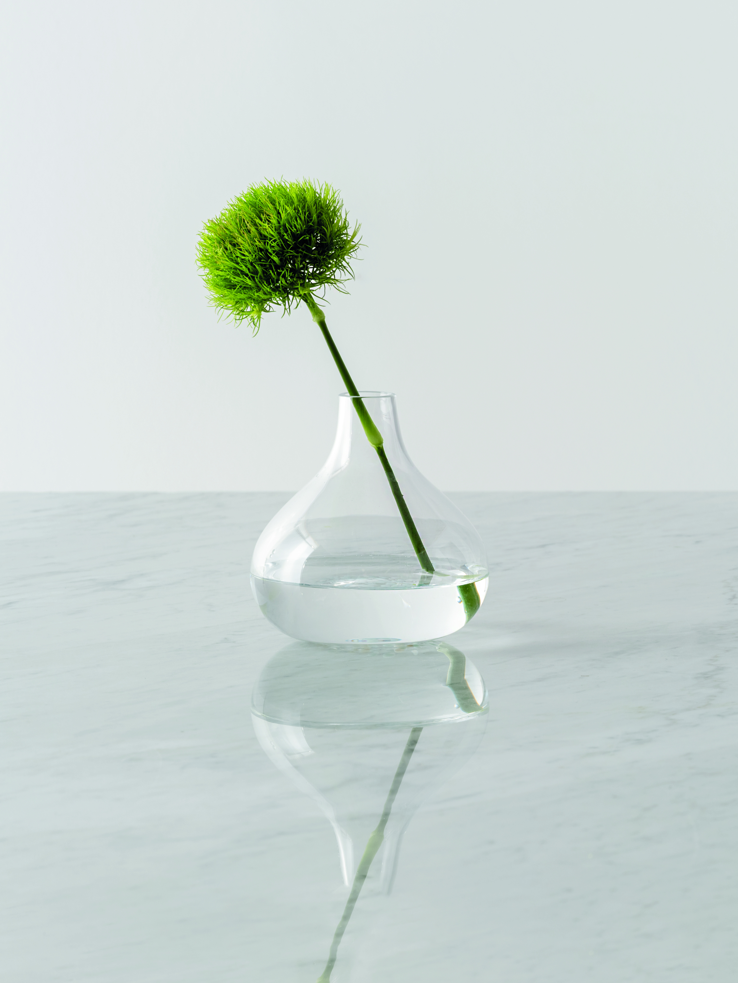 Fuji-vasen är designad av Erika Lagerbielke 2018 i en begränsad upplaga om 200 exemplar. Med vit och blå färgkross i botten av glaset och mjuka former är detta en liten vas lämplig för små sommarblommor.